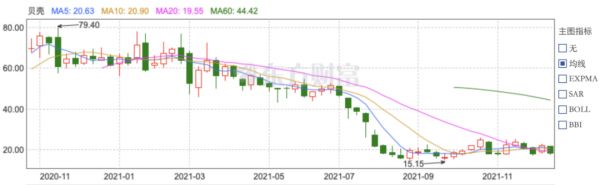 然而接连亏损、裁员风波之下,贝壳股价持续走低。截至2021年12月16日收盘,贝壳股价只剩18.31美元,市值为218.05亿美元,相比巅峰时期蒸发了75%。