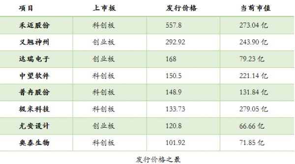 融资中国不完全统计,按照发行价格,超过100元每股的有8家,分别为:禾迈股份、义翘神州、达瑞电子、中望软件、普冉股份、极米科技、尤安设计、奥泰生物,价格分别为557.8、292.92、168、150.5、148.9、133.73、120.8、101.92元/每股。而发行价格最低的分别为南网能源、读客文化、正元地信,价格分别为1.4、1.55、1.97元/每股。
