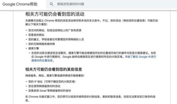 并且,页面上还说明,无痕模式会阻止 Chrome 将用户的浏览活动保存到本地历史记录中。不过,用户的活动(例如位置信息)可能仍会被以下相关方看到:访问的网站,包括这些网站上的广告和资源、登录的网站、雇主、学校或者任何管理用户所用网络的人员以及互联网服务提供商。
