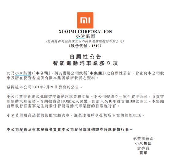 2月底,小米集团发布的公告显示,董事会正式批准智能电动汽车业务立项,拟成立一家全资子公司,负责智能电动汽车业务,首期投资为100亿元人民币,预计未来10年投资额100亿美元,小米集团董事长兼首席执行官雷军将兼任智能电动汽车业务的首席执行官。