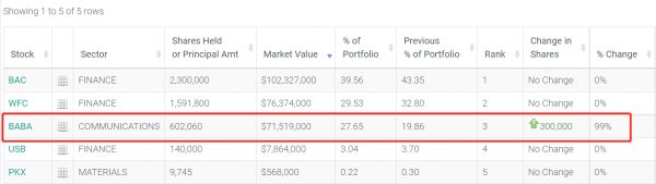 华尔街见闻稍早前文章曾提及,Daily Journal自去年一季度起建仓阿里,截至去年3月末持有阿里巴巴165320股,且该股在其投资组合中的占比高达19%。建仓原因是其需要一些证券作为现金等价物,这些现金等价物通常是美国国债,但由于美债的投资回报率太低,公司转而投资了普通股。