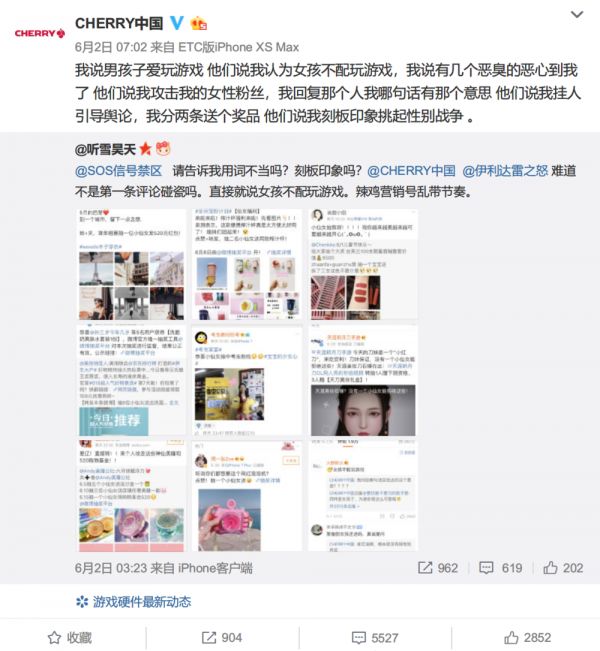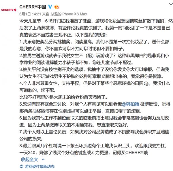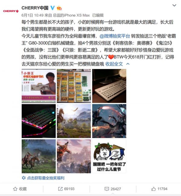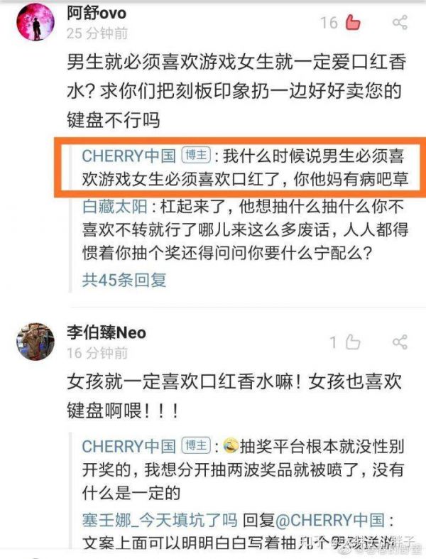 事件的起源是一则抽奖微博,时逢六一,各大品牌都会在这个日子推出些营销活动,Cherry 也不例外。这则微博中,CHERRY 中国选择抽几位“男生”送出机械键盘及几款游戏:
