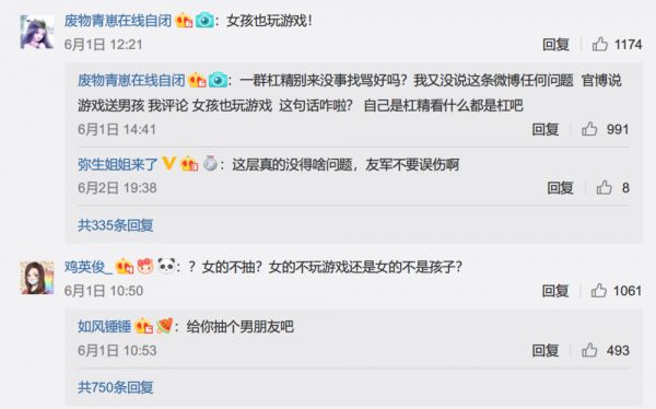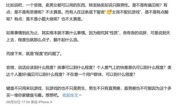 这看起来似乎是一则再正常不过的抽奖微博,没什么不妥。不过,也正是这样一条微博,引发了一场闹剧。因为抽奖的微博文案,多次强调游戏和键盘的抽取对象为“男生”,引发了一些女性网友的不满,认为这是“刻板印象”,乃至“性别歧视”,点赞最多的回复,用反问的语气提出质疑:“女孩不配玩游戏?”