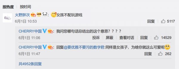 Cherry 的主要消费群体,确实是男生,这不是性别歧视,而是事实,就像口红的主要消费群体一定是女生一样。但 CHERRY 中国的这波操作,已经把自己放到了所有女性的对立面,甚至引发了部分女性用户的联合抵制(且先不管这样的做法是否理智):
