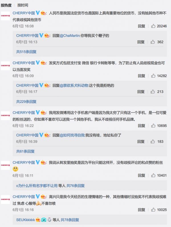 6 月 2 日一早,CHERRY 中国发了一条“总结性”的微博,随后的微博回归到了正常的产品介绍,事件算是告一段落。