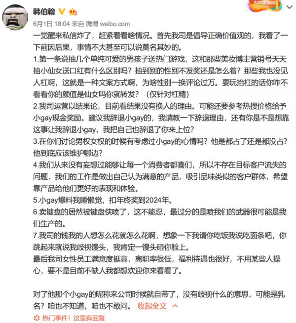 6 月 1 日晚,Cherry 中国区 CEO 韩伯翰针对此次事件进行了回应,大意是说,这次运营活动没有问题,不涉及“性别歧视”,还要给运营人员“小gay”现金奖励。