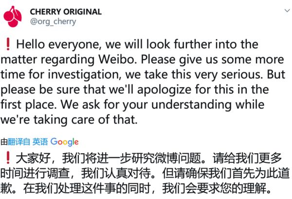 而推特上@CHERRY ORIGINAL(CHERRY 总部的账号)于今日发布了声明,针对微博运营的事情正在进行调查,并对此道歉。