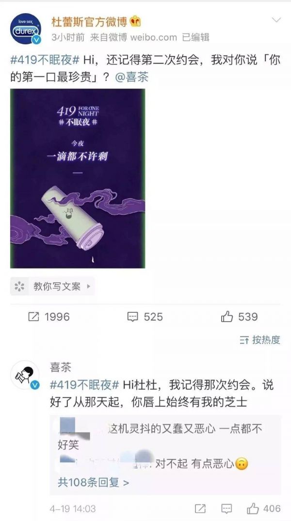 官方微博、公众号的运营,是一门学问。蓝 V 是很难做出性格的,而微博营销,如果想做得让人印象深刻,也是一件收益与风险并存的事。杜蕾斯的热点文案一直被津津乐道,虽然污,但并不恶俗,即便如此,杜蕾斯依然在与喜茶的合作上翻了车。