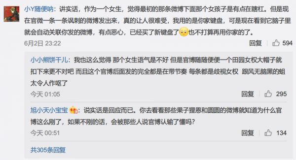 女权在微博上历来都是敏感话题,一点就着,随后事态的发展已经不是 Cherry 中国能控制的了,留言质疑的网友,很快遭受了大规模的人身攻击,其中不乏不堪入目的污言秽语。与此同时,攻击“田园女权”的男性网友,自然也有被回怼的。