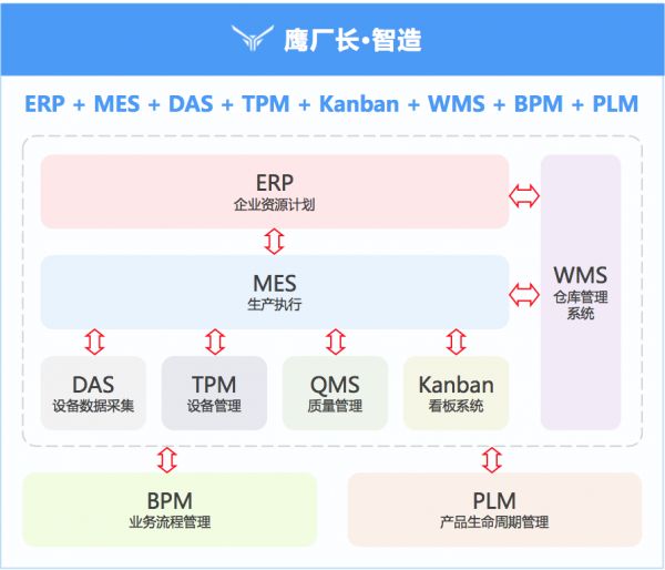 因此,鹰厂长此前蛰伏三年,自研了数字工厂系统,融合了ERP(企业资源计划系统)、MES(制造执行系统)、DAS(数据采集系统)、TPM(设备管理系统)、Kanban(看板系统)、QMS (质量管理系统)、WMS(仓储管理系统)、PLM(产品生命周期管理系统)等等的功能。企业只需要导入鹰厂长这一套系统,就获得了这些系统的能力,极大降低企业在数字化转型方面的试错风险和成本。