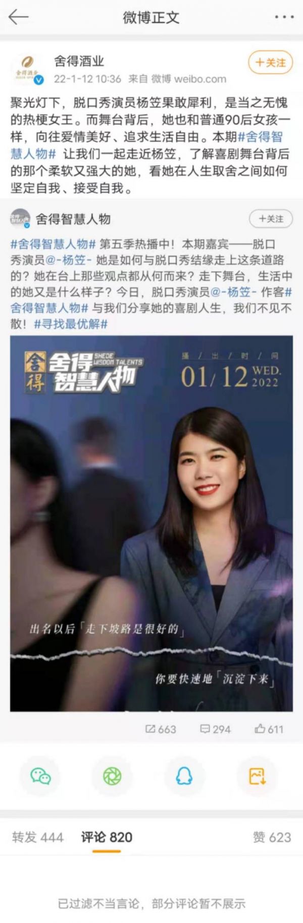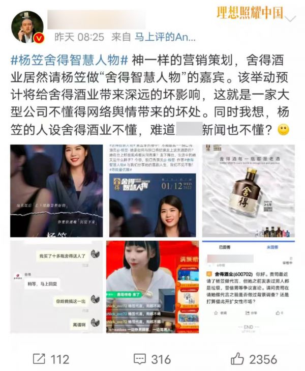 在社交媒体上,不少网友对舍得酒业此次营销宣传表示震惊。有网友认为,杨笠的人设及其产生的网络舆情,预计将给舍得酒业带来深远的负面影响,这是“神一样的营销策划”。