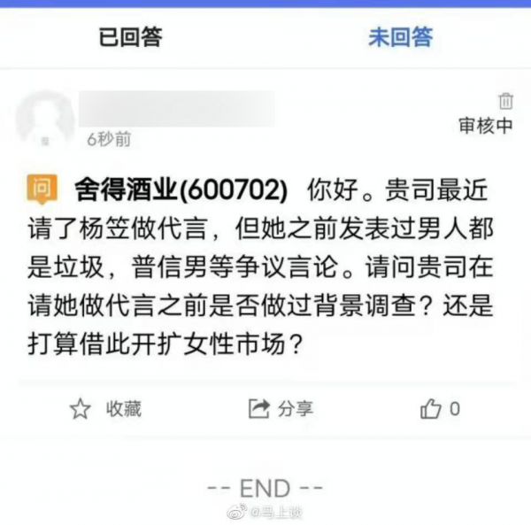 有网友质疑,杨笠此前曾发表过“普信男”等争议言论,舍得酒业依然让杨笠来代言自家品牌。这背后究竟是之前没有做过市场调查,还是有意通过争议舆情来开拓女性市场?