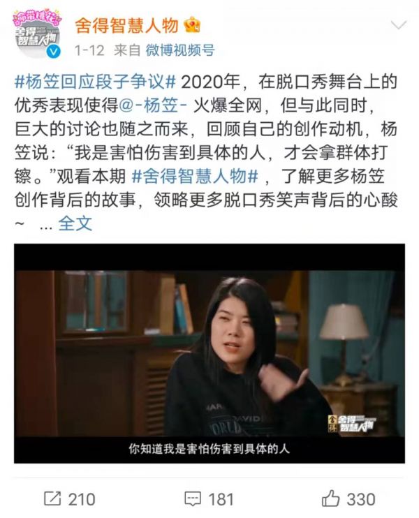 对于杨笠在性别等方面的争议性言论及其引发的舆情。@舍得智慧人物 文案表示:回顾自己的创作动机,杨笠说:“我是害怕伤害到具体的人,才会拿群体打镲。”