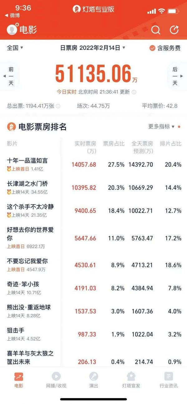 截至发稿前,今日总票房破5.1亿,《十年一品温如言》(以下简称《十年一品》)排片占比达到20.4%,票房占比超27.5%,截至15时31分,票房即已破亿,以绝对优势领跑情人节档,力压已经上映14天、拿下日票冠13天的《长津湖之水门桥》,成为单日票房冠军。