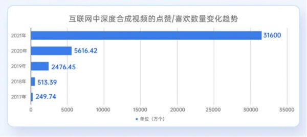 《深度合成十大趋势(2022)报告》显示,互联网深度合成内容创作与传播数量呈指数级增长,国内外十大音视频平台(腾讯视频、爱奇艺、优酷、哔哩哔哩、抖音、快手、微博、YouTube、Twitter、TikTok)内的深度合成视频的点赞量就高达3.16亿。[6]