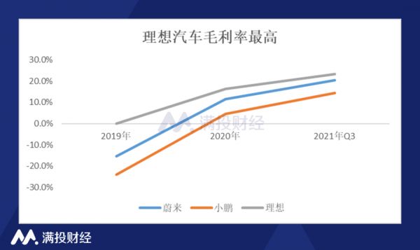 毛利率方面,“蔚小理”的毛利率在2020年的时候均已转正,得益于良好的费用控制,理想汽车的毛利率高于蔚来和小鹏。2020年三季度,理想汽车的毛利率为23.3%,蔚来和小鹏的分别为20.3%和14.4%。