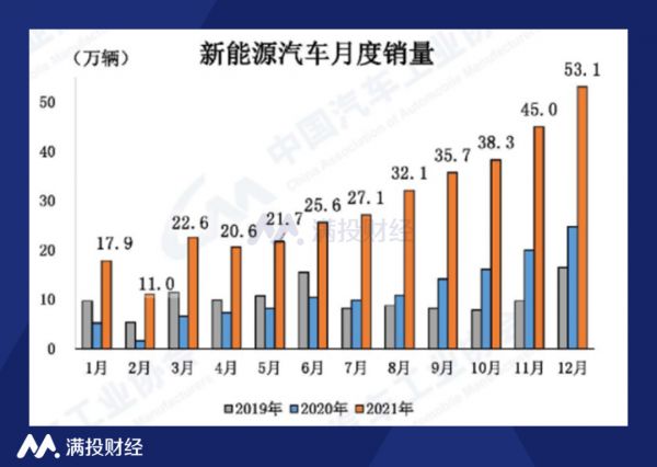 中国是全球最大、发展最快的新能源汽车市场,市场份额领跑全球。根据中汽协数据,2021年中国新能源汽车全年保持产销两旺的发展局面,3月份开始月销量超过20万辆,8月份超过302秦亮,11月份超过40万辆,12月份达到53万辆,表现持续增长的势头。12月份,新能源汽车的产销量分卑微51.8万辆和53.1万辆,再创历史新高,同比分别增长1.2倍和1.1倍。