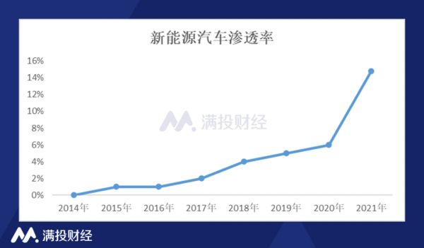 得益于国内新能源汽车产销量的快速增长,中国新能源汽车的渗透率也迅速攀升,特别是国内新能源汽车的渗透率也随销量的增长迅速攀升,特别是2021年以来,提升速度非常快,2021年,中国新能源汽车的渗透率达到14.8%,而2020年仅5.8%。其中,12月单月新能源汽车渗透率达到19.1%,持续高于上月。
