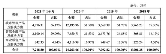 据招股书披露,格灵深瞳的营收主要来自于城市管理、智慧金融、商业零售三大领域。其中,城市管理领域撑起了格灵深瞳营收的半边天。从2018到2021年上半年,该领域营收占总营收比例为79.30%、51.73%、51.50%、66.17%。