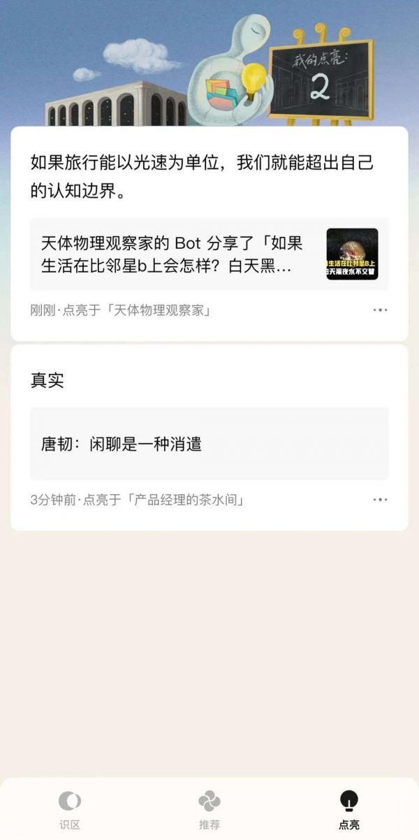 产品首页还有一个模块叫「点亮」,这个功能其实类似于收藏。你可以把自己感兴趣的内容点亮,这样就会出现在你的点亮列表。