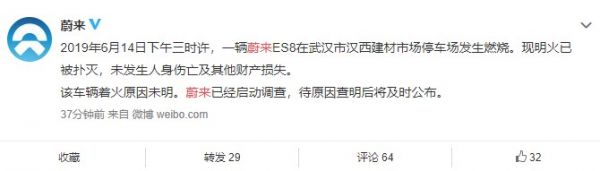 IT之家6月14日消息针对下午微博用户所发布的蔚来ES8在武汉市自燃的事件,蔚来在官方微博发布声明,称明火已被扑灭,未发生人身伤亡及其他财产损失。该车辆着火原因未明。蔚来已经启动调查,待原因查明后将及时公布。