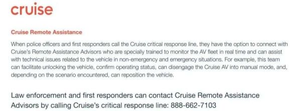 以此次发生意外的Cruise为例,Cruise运行的无人车上都有可远程操控的设备,以确保工程师能远程开关门、关闭自动驾驶系统等。同时,Cruise也公开了紧急热线,以便在出现问题时执法人员能联系上Cruise。
