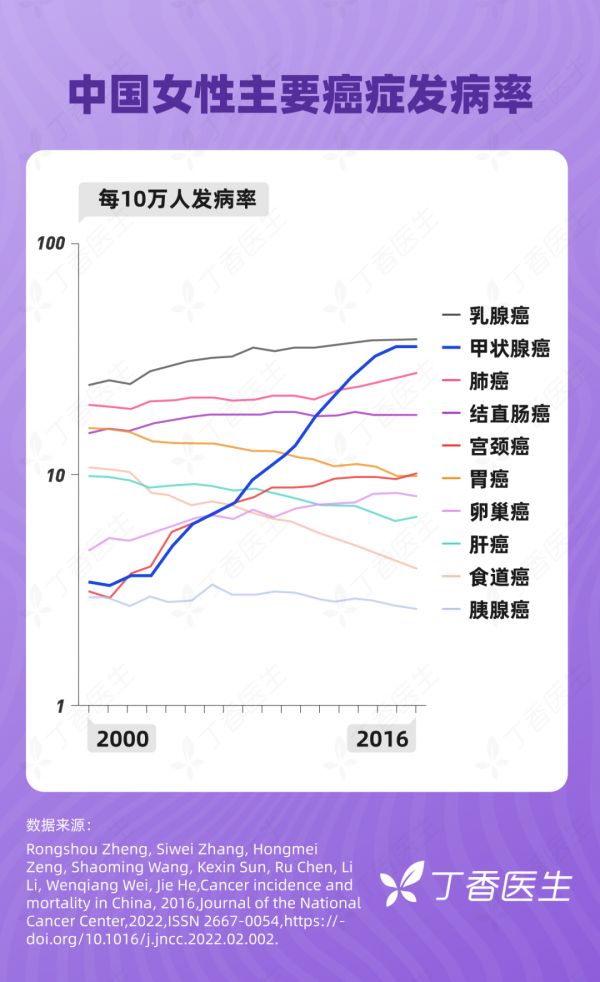 自 2000 年起,甲状腺癌以年均 20% 的增长速度迅速发展成为中国女性最常见的癌症之一,并且大有超越乳腺癌之势。