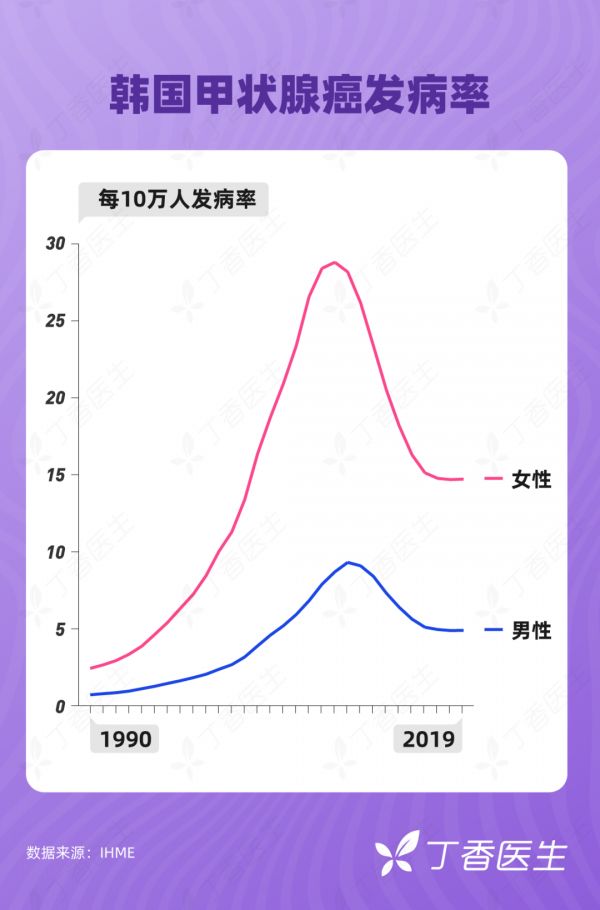 韩国的甲状腺癌暴增早于中国,本世纪的前十年里更为明显,1999~2008 年间,发病率暴增 7 倍,使得甲状腺癌在 2009 年登顶成为韩国人发病率最高的恶性肿瘤,同时也让韩国成为全球甲状腺癌发病率最高的国家。