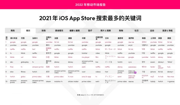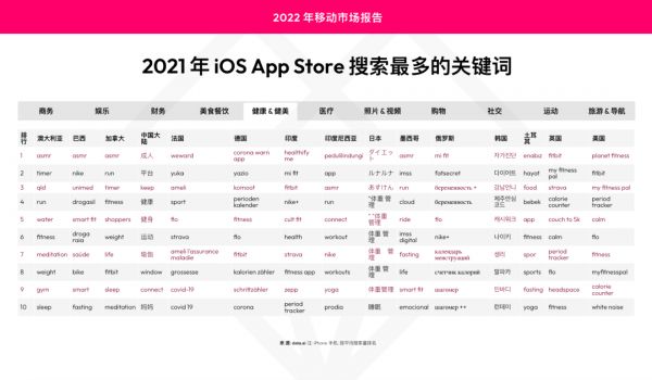 考虑到所有这些要点,将有助于您的全球业务布局。在 data.ai 发布的《2022 年移动市场报告》中,我们列出了 15 个国家/地区中 11 种应用类别的年度热门关键词,为您在目标市场和类别的关键词规划提供了有价值的参考。
