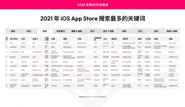 在其他应用类别中,地区差异更为明显。以财务类为例,在所有国家/地区中,用户都会搜索的应用仅有 PayPal,除此以外则由本地词汇占主导地位,尤其是那些与新兴银行应用相关的关键词。