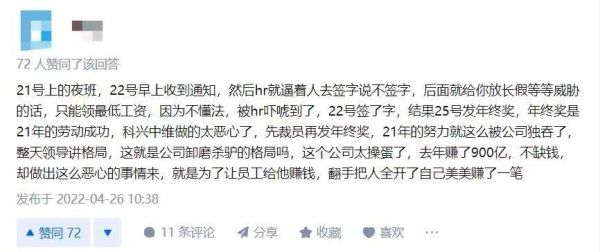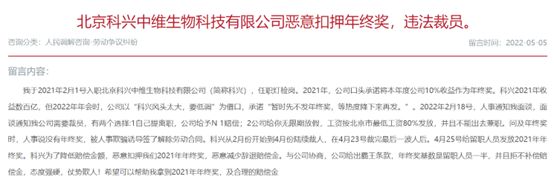 该名自称2021年初入职的员工称,科兴21年口头承诺10%的收益作为年终奖,却在22年年会上以“风头太大”的理由推迟发放年终奖。随后,科兴自2月份开始裁员,4月23日最后一批员工走人后,科兴在两日后发放年终奖,恶意减少辞退赔偿金。