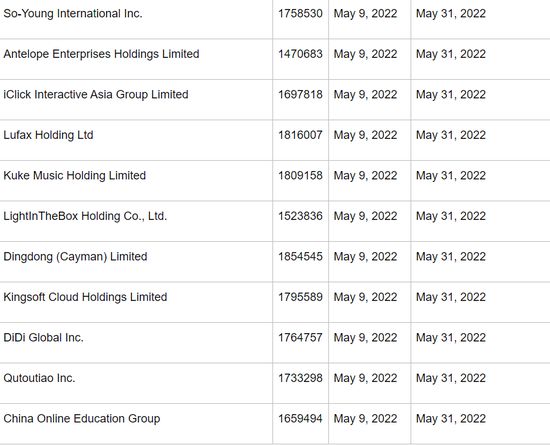 SEC官网公布的名单显示,被列入“预摘牌名单”的包括滴滴、陆金所、金山云、库客音乐、趣头条、51Talk、Antelope Enterprise、新氧科技、爱点击、叮咚买菜和兰亭集势。