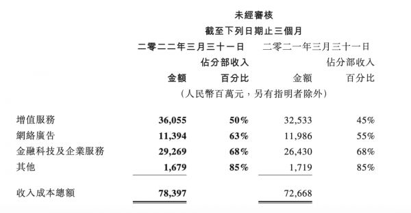 一季度,尽管金融科技及企业服务的收入成本占分部收入的比例在三大业务中仍是最高的,但却是唯一一个比例未有明显增长的业务。