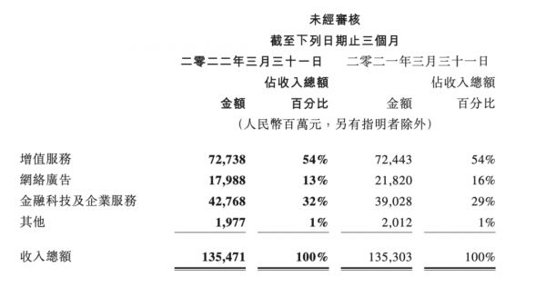 腾讯营收主要由三部分构成:其中增值服务收入727亿元,去年同期为724亿元;网络广告收入为180亿元,同比下滑18%;金融科技及企业服务收入为428亿元,同比增长10%。