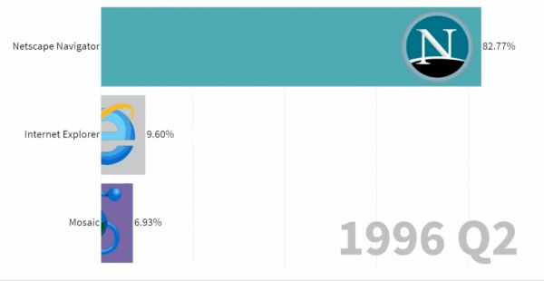 1995年8月16日,IE浏览器正式登上历史舞台,凭借着与Windows系统的捆绑,仅用三年时间,IE就踏着昔日霸主网景(Netscape)的残骸,在全球浏览器市场中封王。