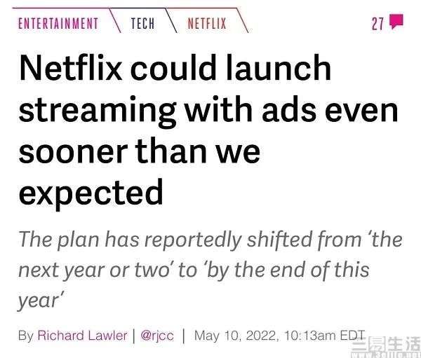 虽然当时Spencer Neumann曾表示,(引入广告)并不是公司目前计划中的事情,但仅仅时隔两个月不到,在奈飞方面发布2022第一季度的财报后,“带广告的低价订阅服务”已然成为了计划中的事情,甚至还加上了一个确切的时间点。