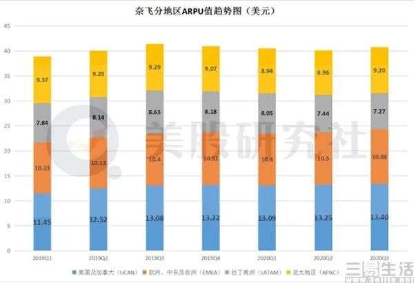 根据官方公布的2021年财报显示,奈飞北美地区每用户月付费(ARPU值)达14.56美元,远远超过亚太地区的9.56美元、拉丁美洲的7.27美元。而在数量上,北美地区付费会员数为7521万,欧洲、中东和非洲地区付费会员数是7403.6万,拉美及亚太地区则分别为3996.1万及3263.2万。从中不难发现,ARPU值更高的区域用户数量同时也是最多的。