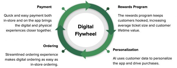 数字飞轮指的是星巴克通过将人工智能和其他数字技术应用于其移动应用,来整合和优化其数字和实体体验的举措。飞轮的四个支柱分别是:星巴克奖励计划、应用程序的个性化、购买体验和支付流程。