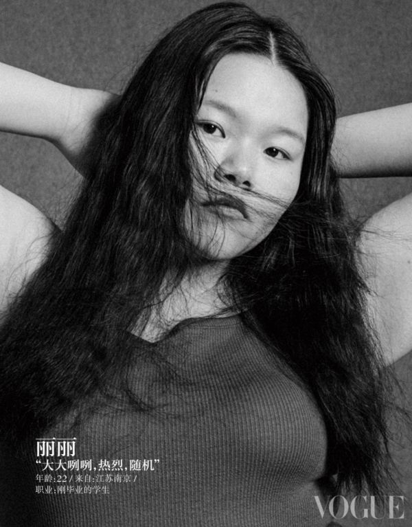 最幸运的一次,是去年参与国内《VOGUE》9月刊中的拍摄。丽丽是15位Vogue新面孔中的一员,也是其中唯一一名大码模特。