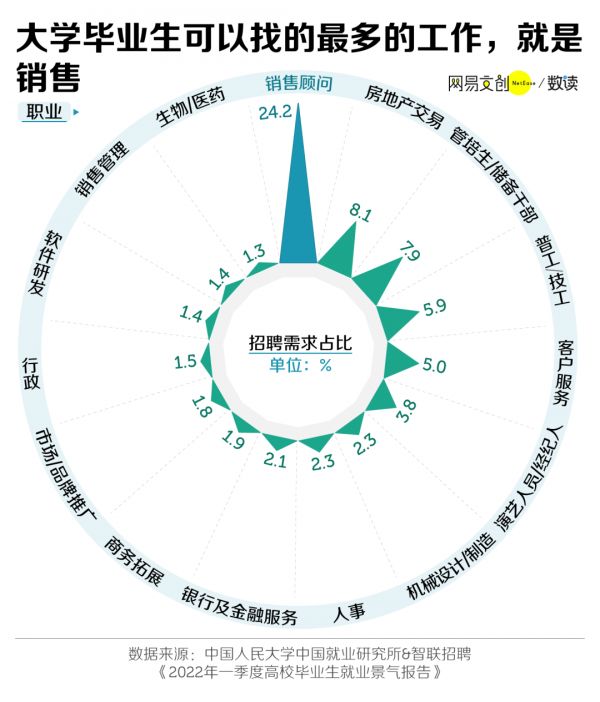 2022 年一季度,中国所有面向高校毕业生的招聘岗位中,占比最多的就是销售顾问,达到 24.2%,断层第一 [2]。