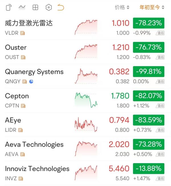 今年以来,海外激光雷达公司在资本市场的表现堪称灾难,Velodyne、Ouster、AEye年内跌幅已超九成,Quanergy、Aeva、Cepton、Innoviz、Luminar 等公司的市值也至少腰斩。