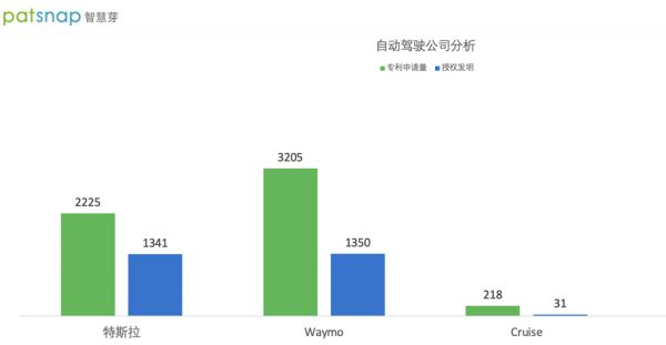 通过智慧芽全球专利数据库查询看到,特斯拉在全球拥有2225件已公开的专利申请。其中有效的1200多件专利中,在神经网络、自动驾驶、车辆以及锂电池相关领域。从专利量来看,特斯拉的2225件不足Waymo3205件的70%,但从已被授权的发明专利来看,两家公司旗鼓相当,Cruise略少。