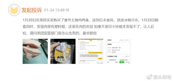 有用户表示,其在美团上下单的羊腿肉,收到商品后不仅部位不明同时还存在发黑问题;另有消费者表示,其在美团买菜购买的壹号土猪肉两盒,发现肉的夹层内里塑料棍。