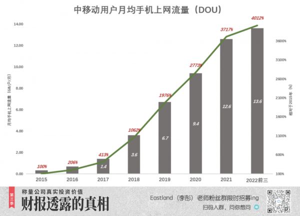 2019年5G正式商用,DOU同比增长86%,但增速降至2018年的一半。2020年DOU增速进一步降到40%;2022年前三季,DOU达13.6GB,相当于2015年的4012%。