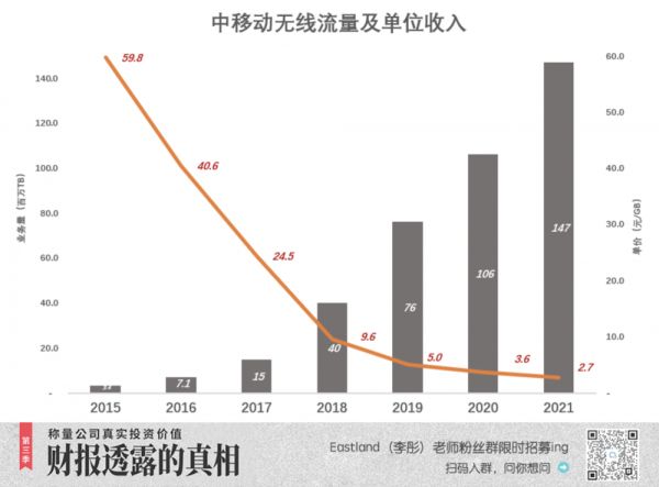 2020年、2021年,中移动累积增加了2.6亿5G用户。2021年移动用户无线总流量1.47亿TB,每G资费2.7元,相当于2015年的4.5%。
