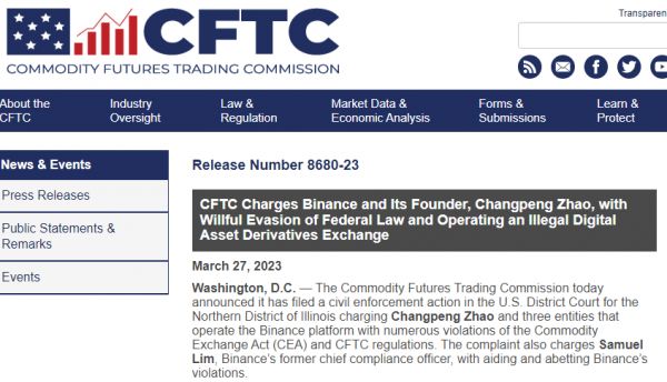 据悉,CFTC于美东时间3月27日在芝加哥联邦法院提起了上述诉讼。CFTC表示,币安没有在其注册,从而逃避了一系列其应尽的义务。
