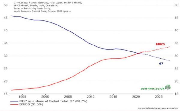 就在不久前,国际货币基金组织发布的《世界经济展望报告》显示,按照购买力平价计算,截至2022年10月,金砖五国在全球GDP中所占份额已经超过了G7。