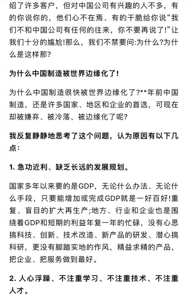 那我国制造,为什么被世界边缘化了呢?这个自卑的作者给出了理由——还是老一套,“急功近利、缺乏长远的发展规划;人心浮躁、不注重学习、不注重技术、不注重人才”(如上图)。