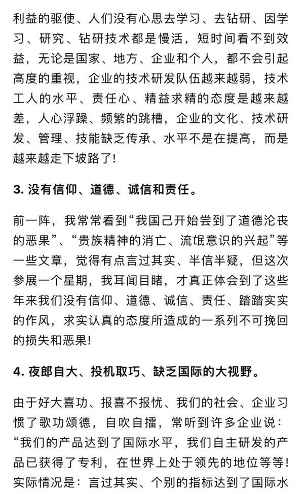 还有我们中国人“没有信仰、道德、诚信和责任;夜郎自大、投机取巧、缺乏国际的大视野;大专院校、科研机构与企业的衔接太差……”(如下图)。