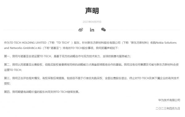 不过对于这笔交易,华为方面并不同意,随后做出了声明称,华为认同诺基亚出售股权,但没有任何意愿及可能与新东方材料料合资运营TD TECH。